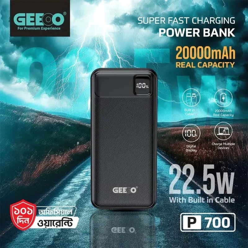 Stay powered throughout the day with the GEEOO P700 Real Capacity Super Fast Power Bank. Featuring a massive 20000mAh battery, built-in charging cable, multi-device support, and a clear digital display, it’s the perfect companion for your mobile lifestyle. Equipped with super-fast charging and advanced safety protection, it ensures your devices are charged quickly and safely, anytime, anywhere.
